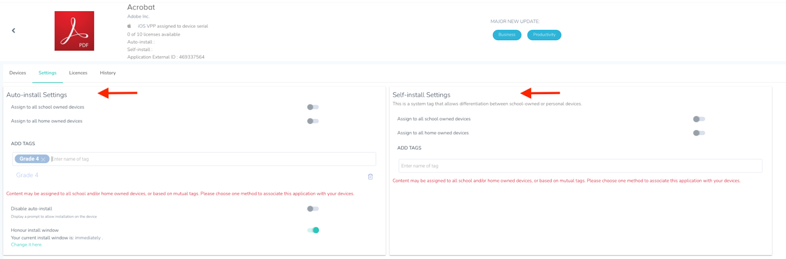 Using tags helps you mass assign applications to selected devices and categorise them as home-owned or school-owned.