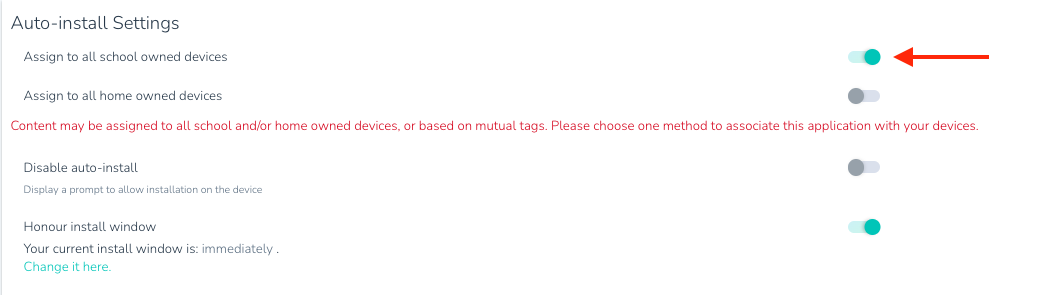 - Auto-Install Settings: Assign the application to all school-owned or home-owned devices.