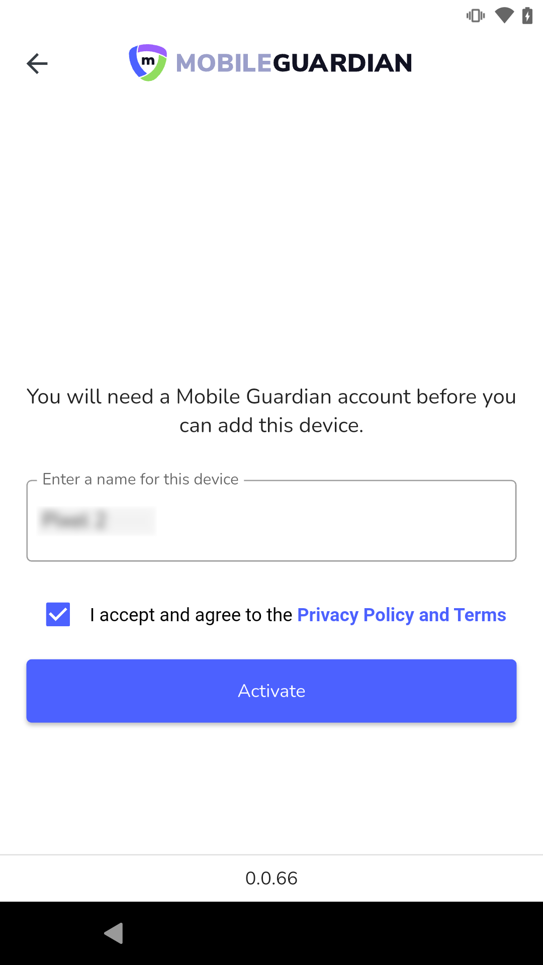The user must then name the device and check a box to acknowledge and accept the Mobile Guardian Privacy Policy and Terms.