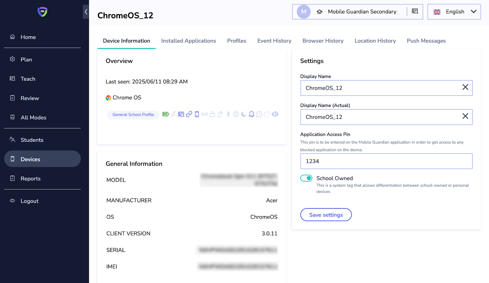 - Device Information. View current device settings, e.g. whether the device is supervised, ownership status, whether alert notifications are enabled or not, operating systems information etc.