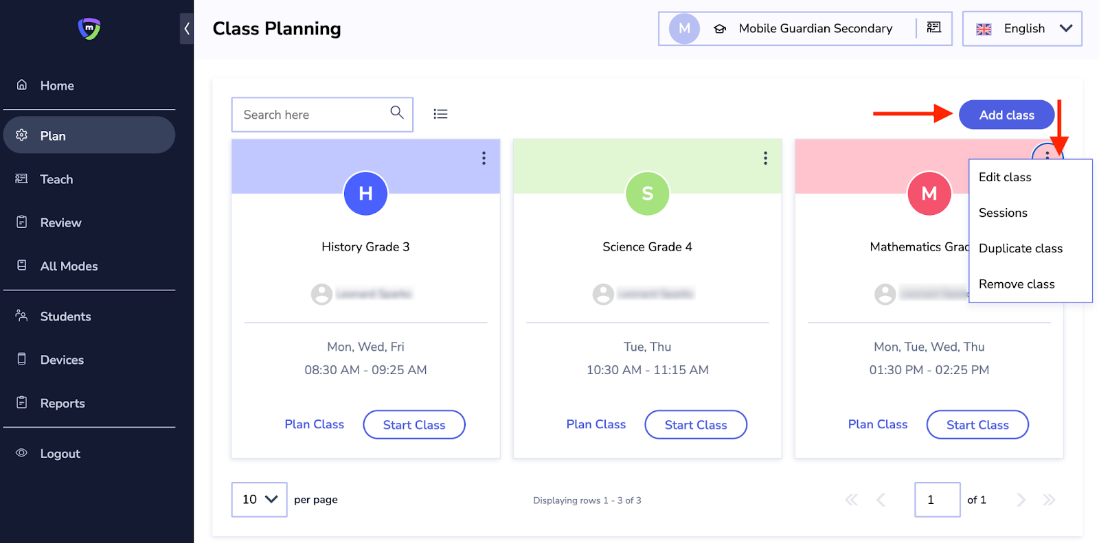 This section enables you to add new classes and edit existing ones with the options available to duplicate, remove, edit schedules, search, and view all the classes that you have added.