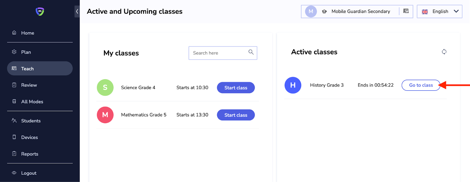 On the Teach tab, you can view your active and upcoming classes. This section also allows you to start a class.