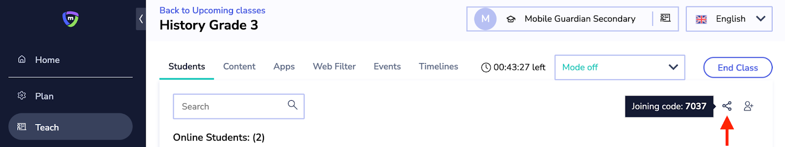 Using class Join codes, students can opt-in to classes which their devices are not assigned to, from within the My Classes tab with-in the Mobile Guardian application. Having students opt-in, ensures that their devices don’t switch state when they are not in an active class.