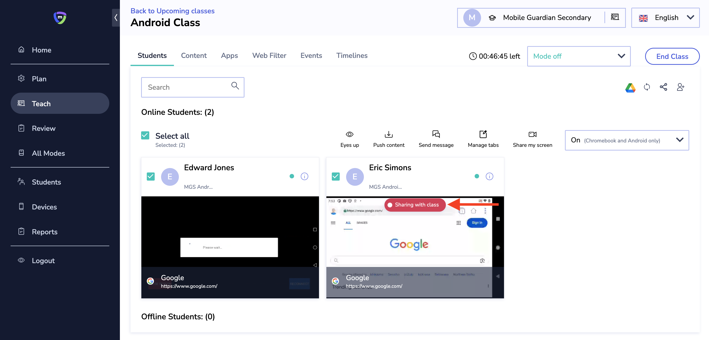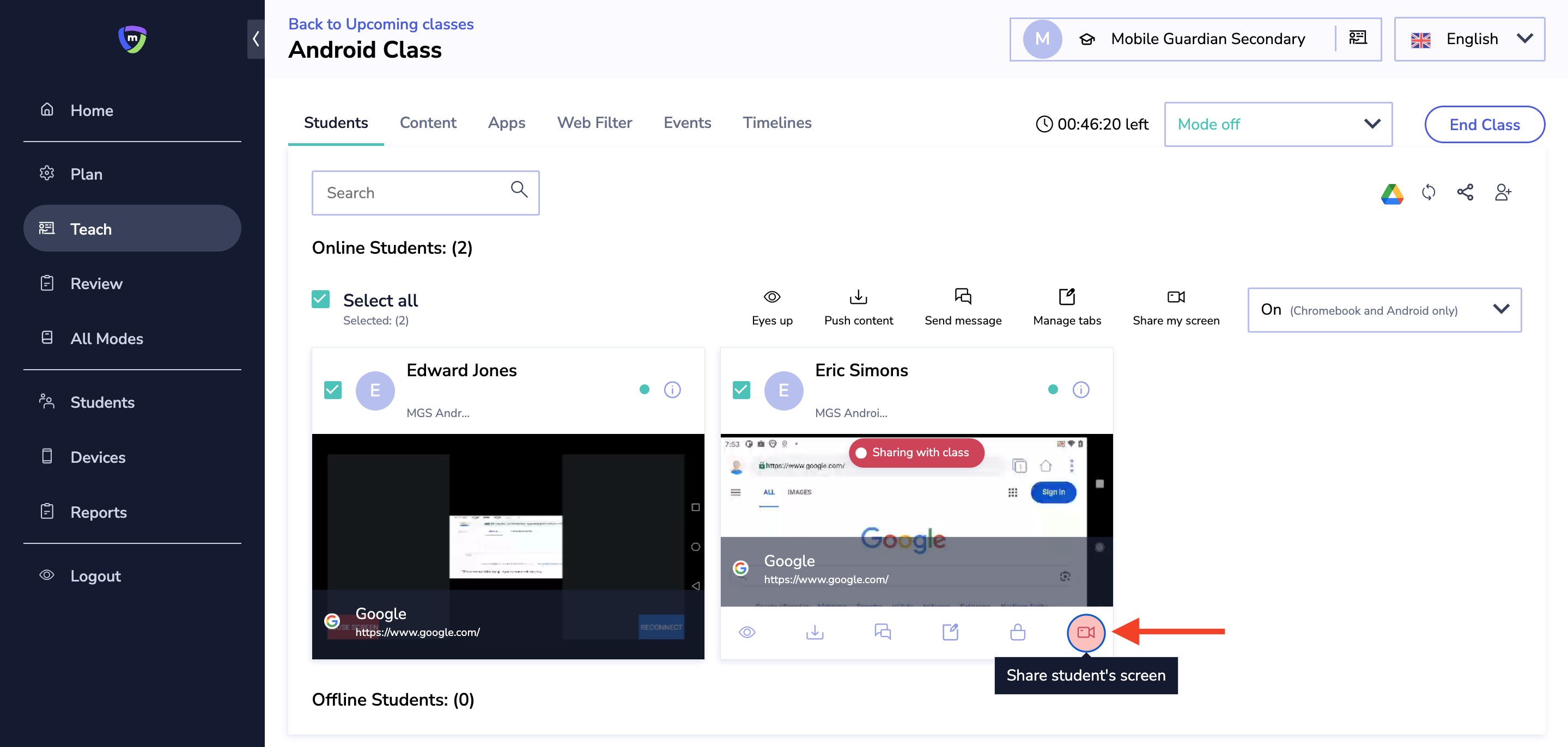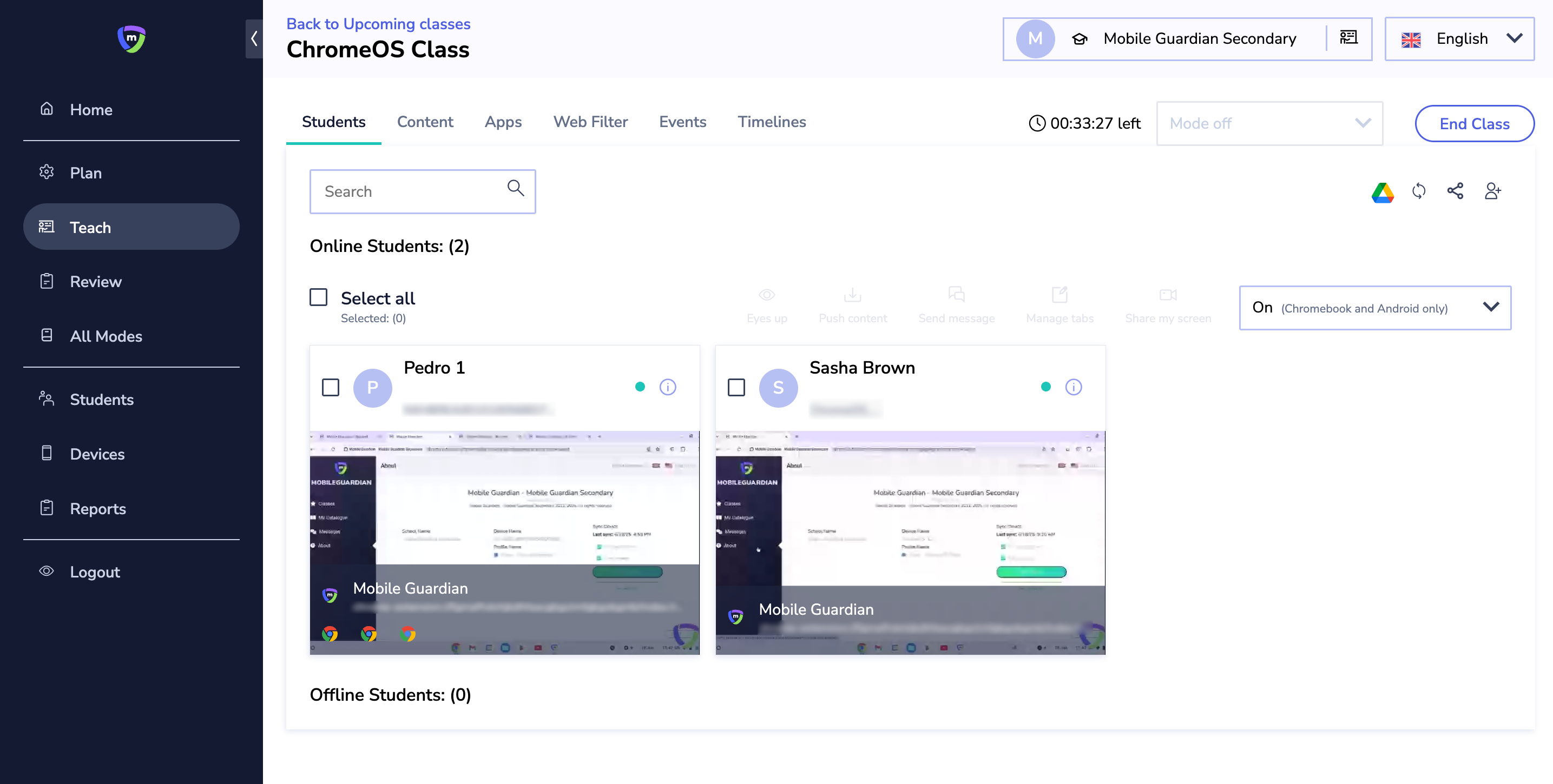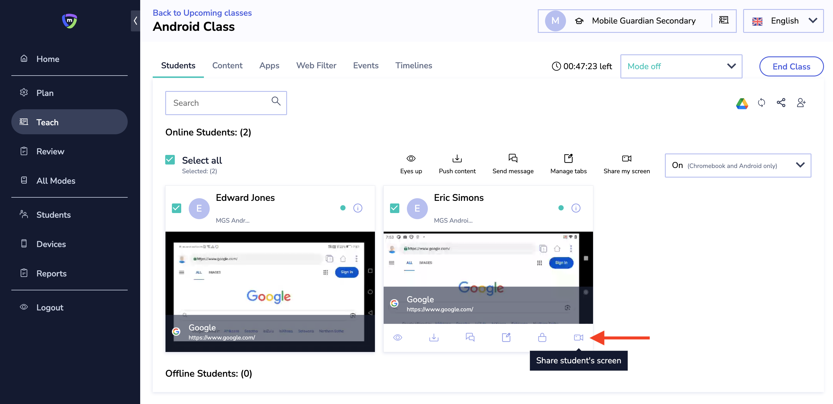 The Mobile Guardian Classroom Management Tool empowers teachers to oversee, in real-time, their students' screens during class. This feature ensures students stay focused and on track. Currently, the screen share option is available for ChromeOS, Android and Windows devices.