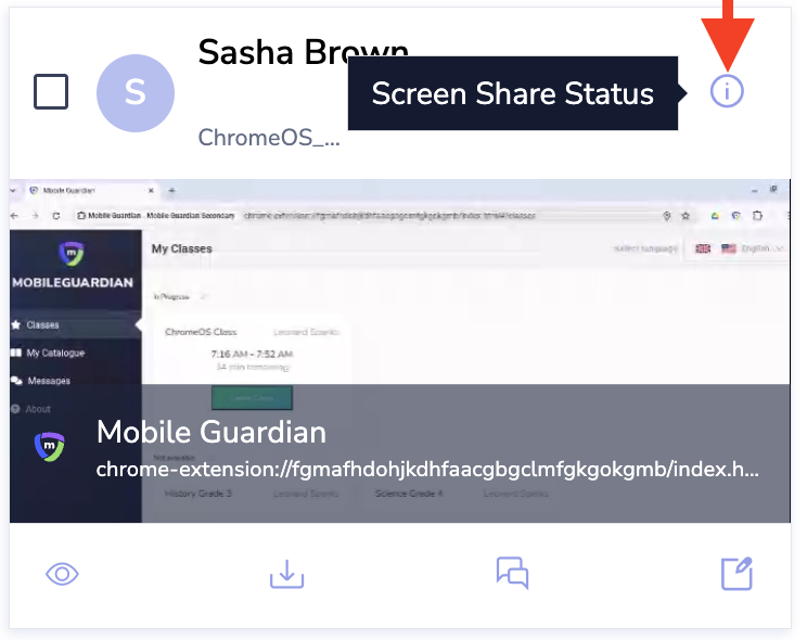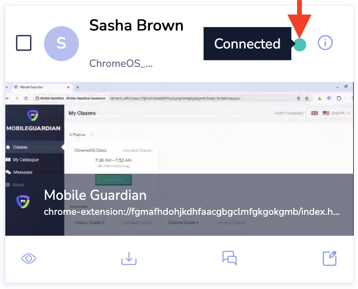 When a class is active in the Mobile Guardian platform, teachers can select the Screen Share Status icon to access the "Screen Share status table" table. This table is designed to show the real-time connection state of the device to the class to provide teachers with a more intuitive and actionable overview of device connection states.