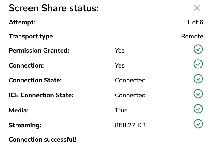 When selecting the screen share status icon, a table will appear with information about where the connection as passed or failed, along with attempts to connect, the streaming speed and the type of streaming connection.
