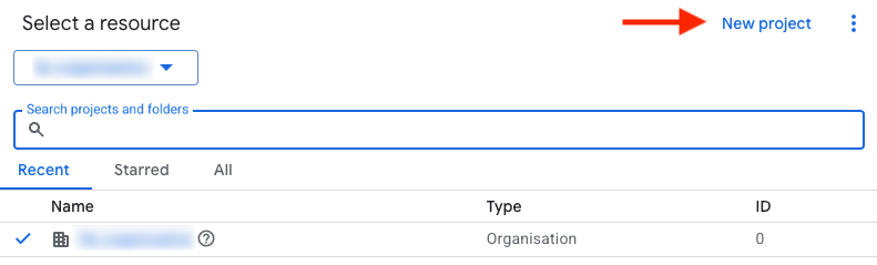 - Choose the relevant organisation from the drop-down list and click "New Project".