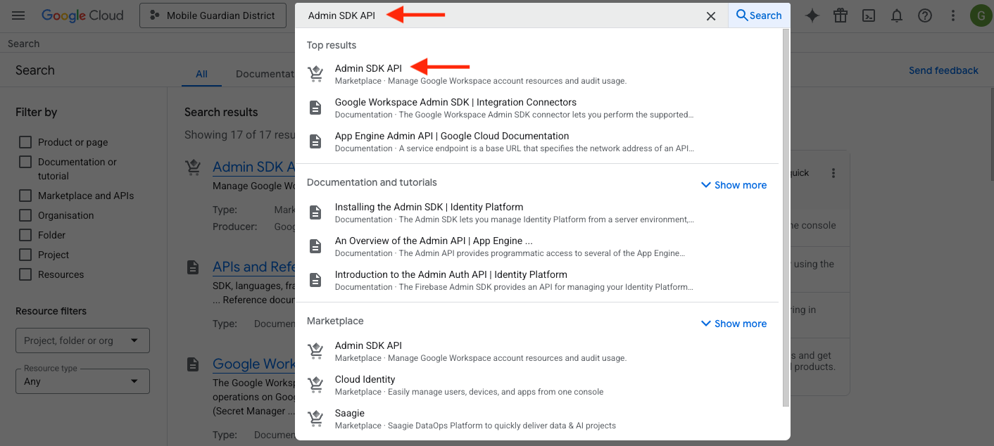 - In the search field, search for "Admin SDK API" and select the API.
