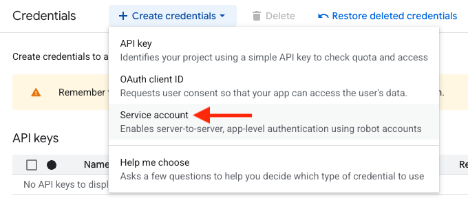 - Choose "Service account" from the drop-down menu.