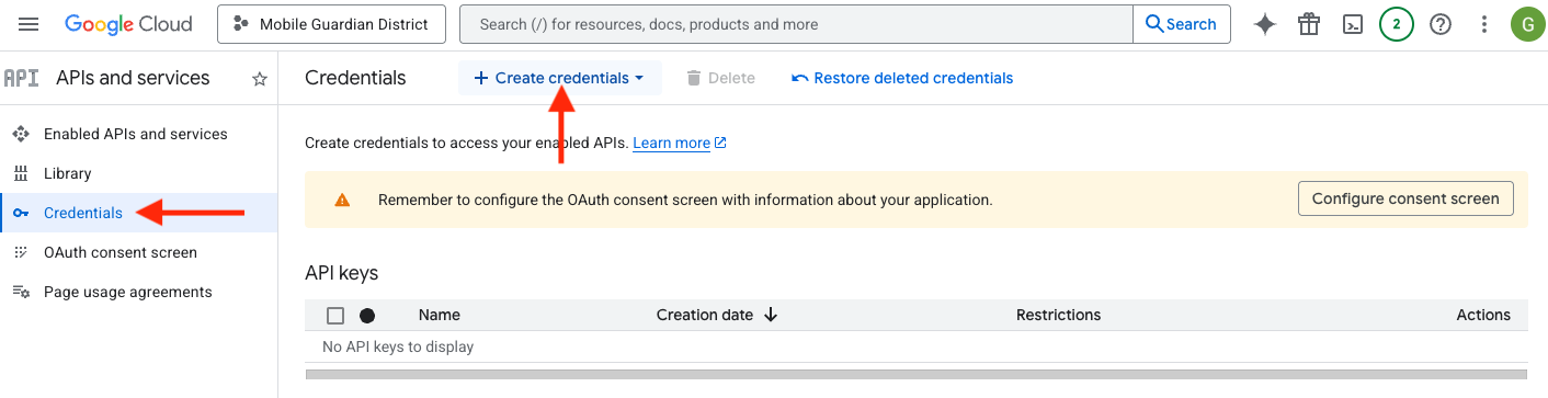 - Click on the "Credentials" tab, then "Create credentials".