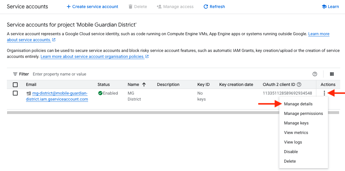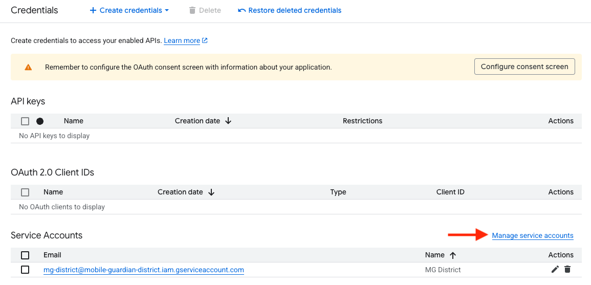 - Click on "Manage service accounts".
