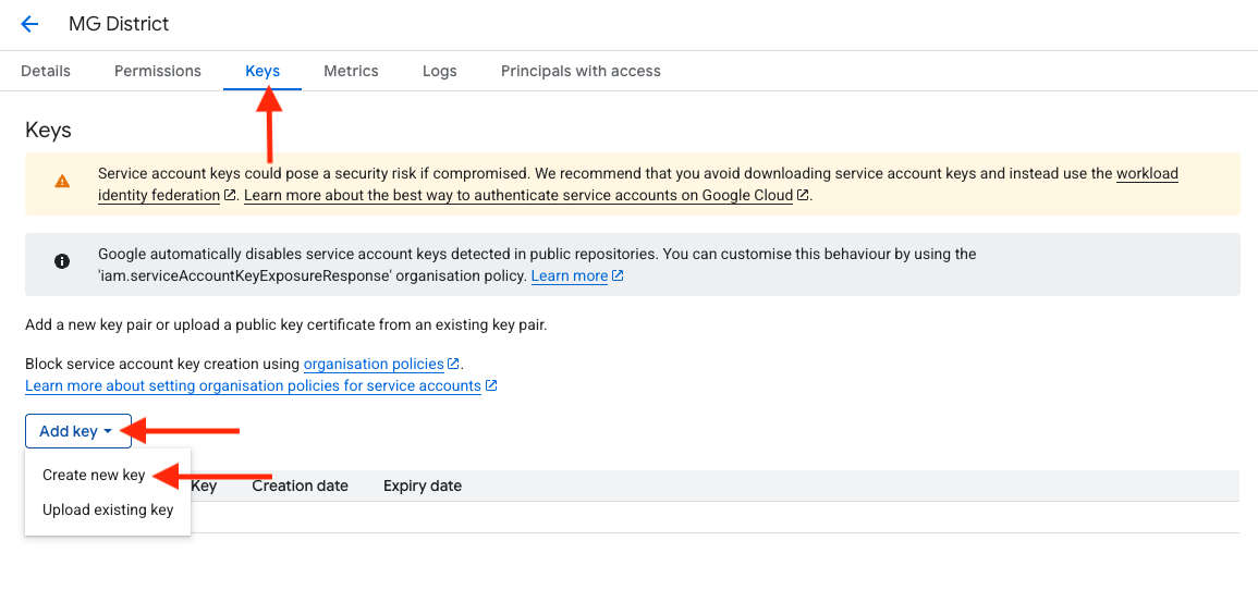 - Click on "Add key" and select "Create new key".