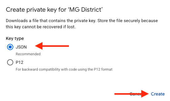 - From the pop-up screen, ensure the JSON option is selected and click "Create" to download the JSON file.