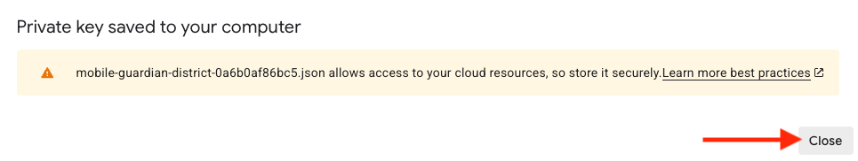 This file contains the credentials needed to link your systems. Keep it in a secure location; you will be prompted to upload it to your Mobile Guardian District Dashboard in a later step.