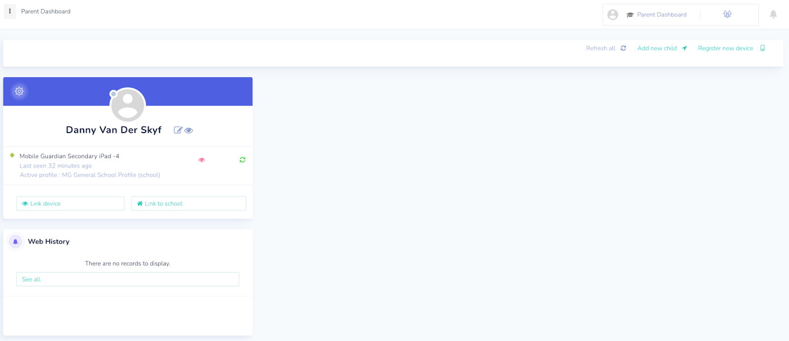 - If a student and device are linked to the parent account, the parent will see a student card and linked device on their dashboard.