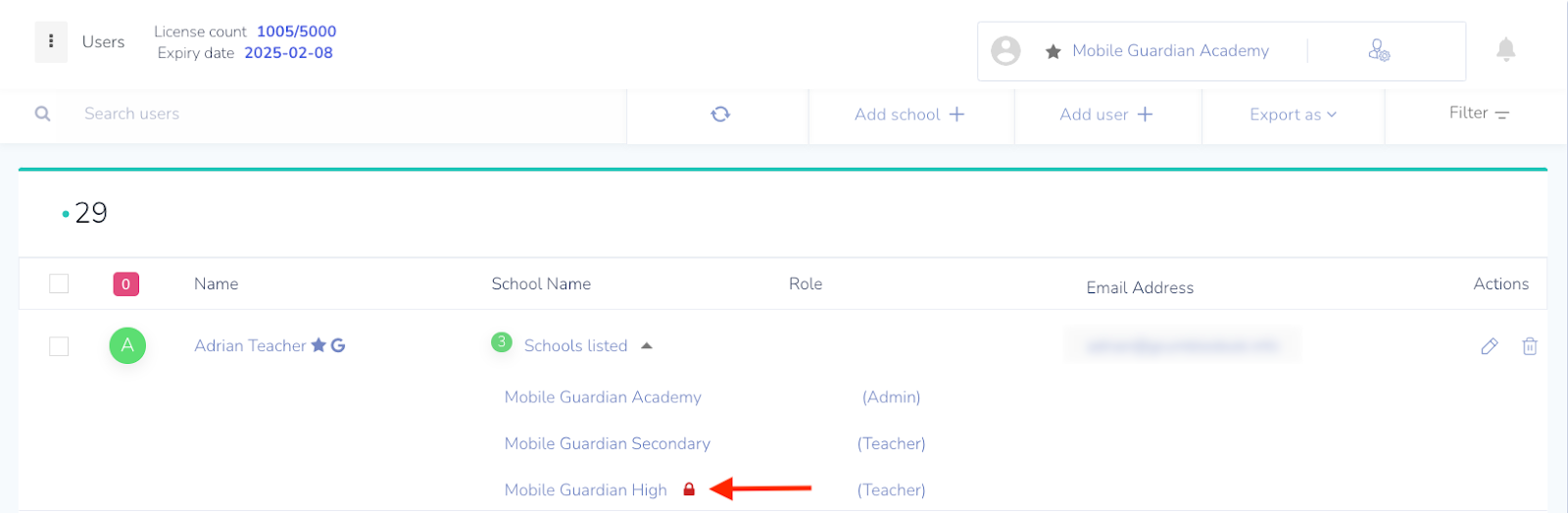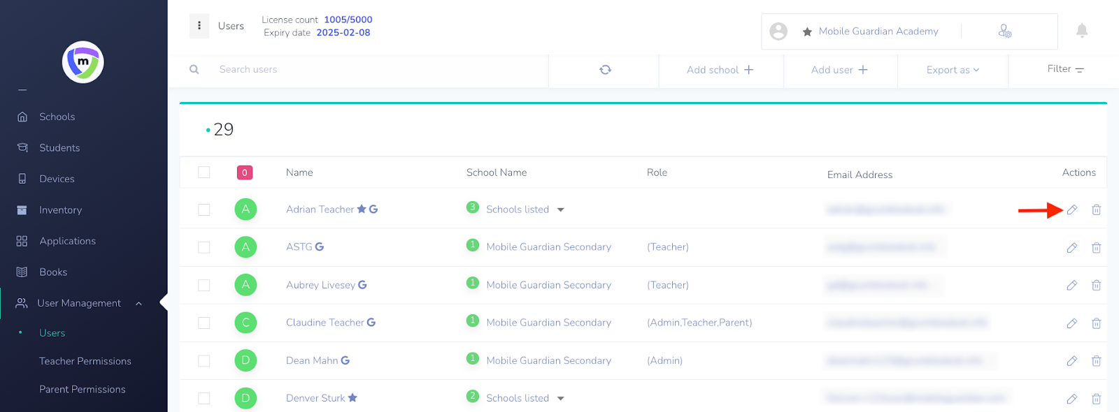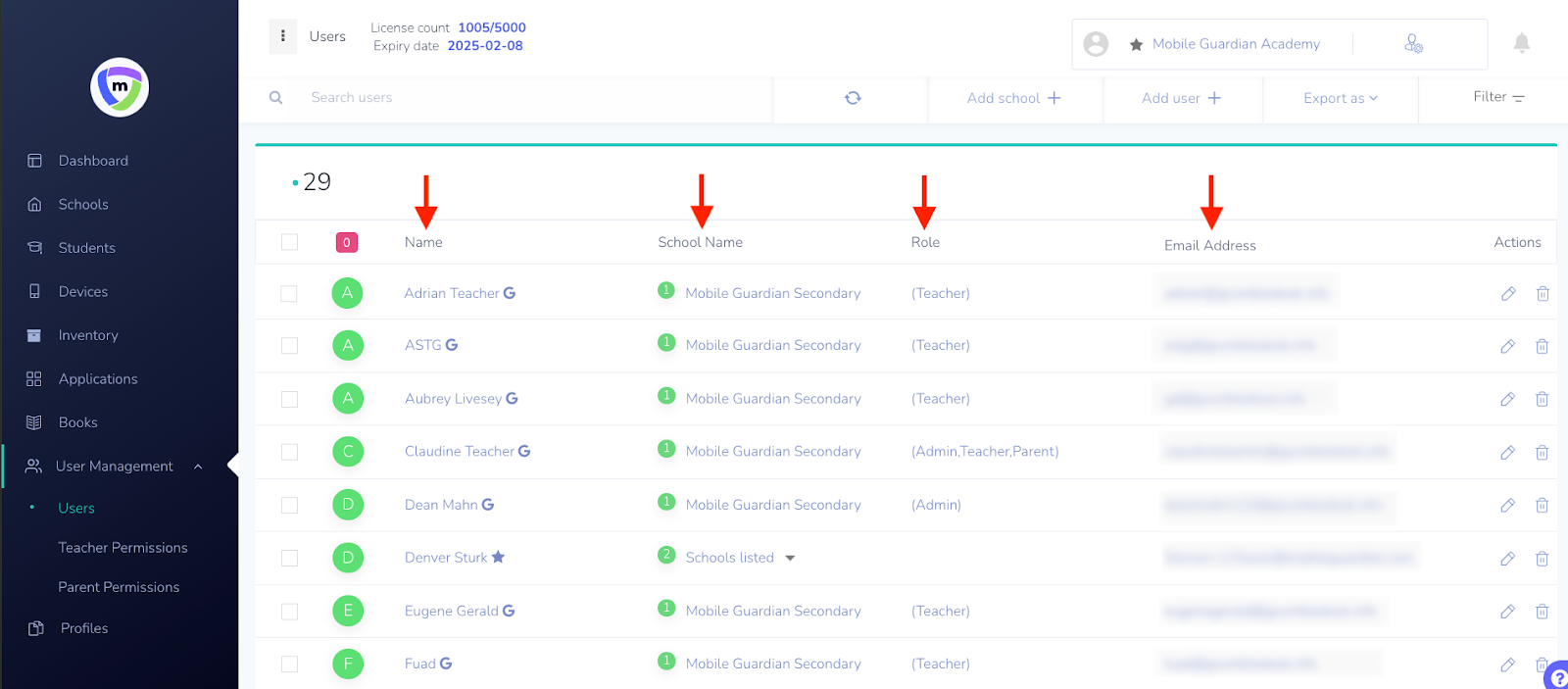 - Here, you will see a list of users, including their Name, School Name, Role, and Email Address.