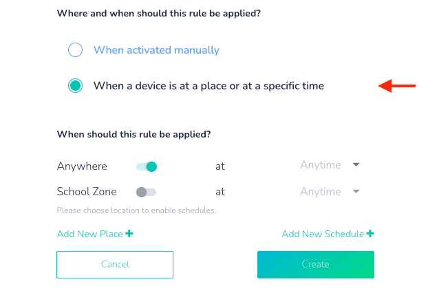- Choose the option to apply the rule when the device is at a place or at a specific time.