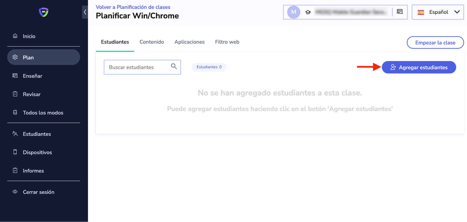 Para añadir manualmente a sus estudiantes o sus dispositivos a las clases, seleccione una clase desde el panel de Plan y haga clic en el botón Planificar clase.