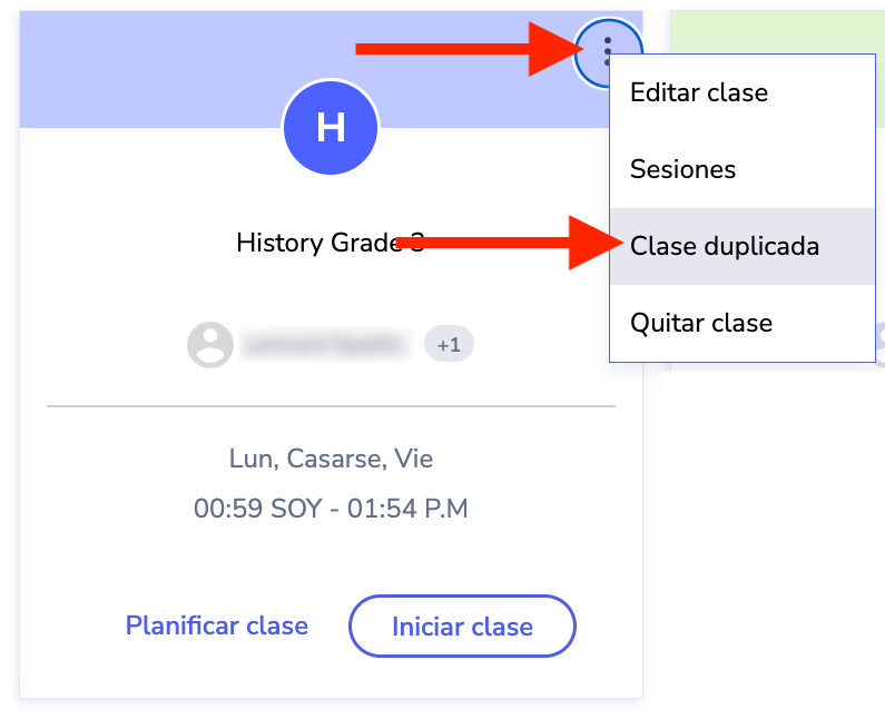 - Haga clic en el menú de acciones (kebab/tres puntos) de la clase que desea duplicar.