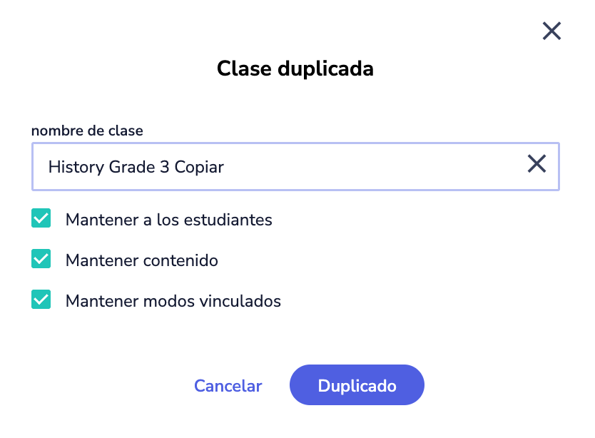 - Seleccione si desea añadir el Contenido, los Estudiantes/dispositivos o los Modos existentes. Si desmarca cualquiera de estas opciones, dicho elemento NO se copiará a la nueva clase.