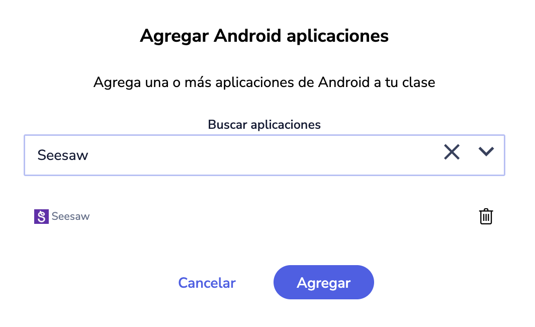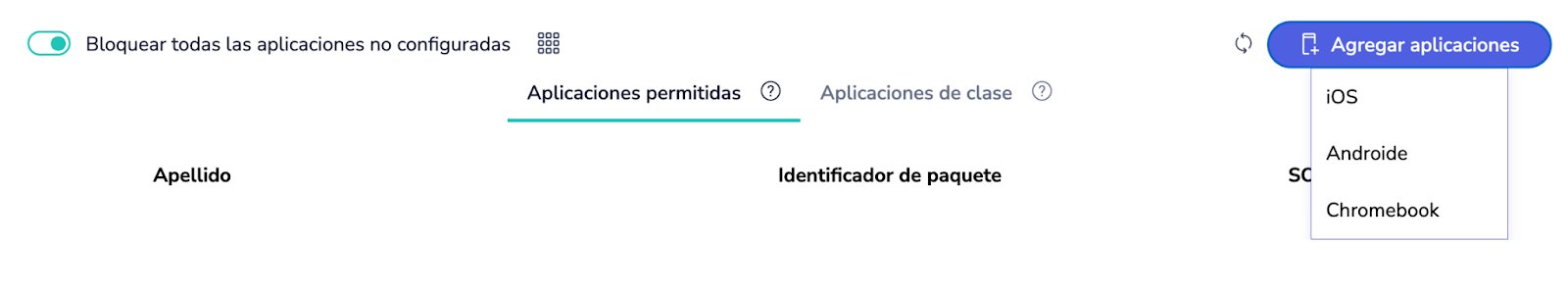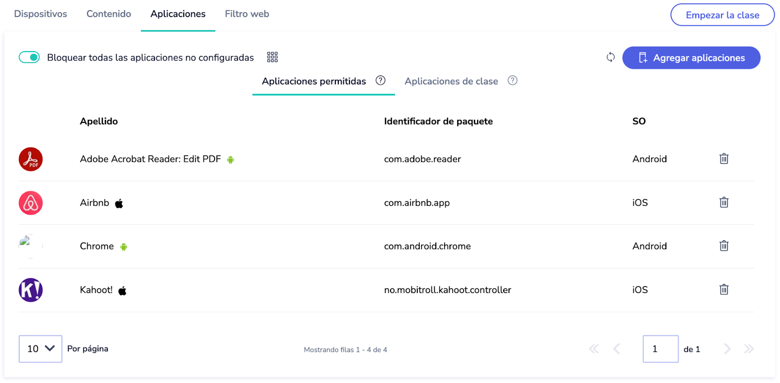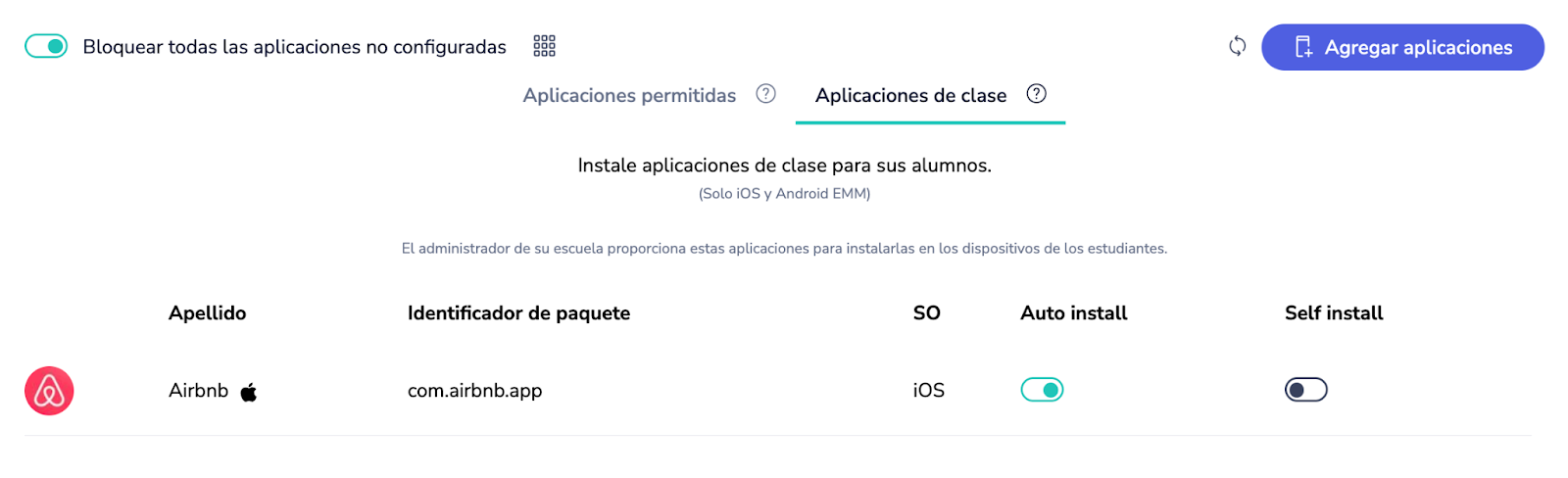 Las aplicaciones configuradas para su clase aparecerán en esta lista para permitirle asociarlas o instalarlas en los dispositivos de sus estudiantes.