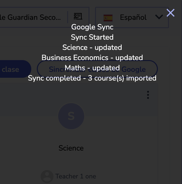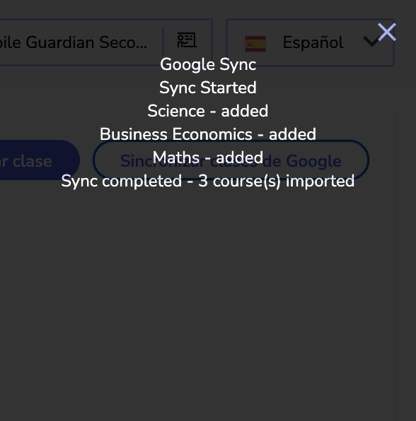Una vez iniciada la sincronización, una ventana emergente le informará sobre la información que se está importando. Al finalizar, debería ver cómo su panel de control se llena con sus clases de Google.