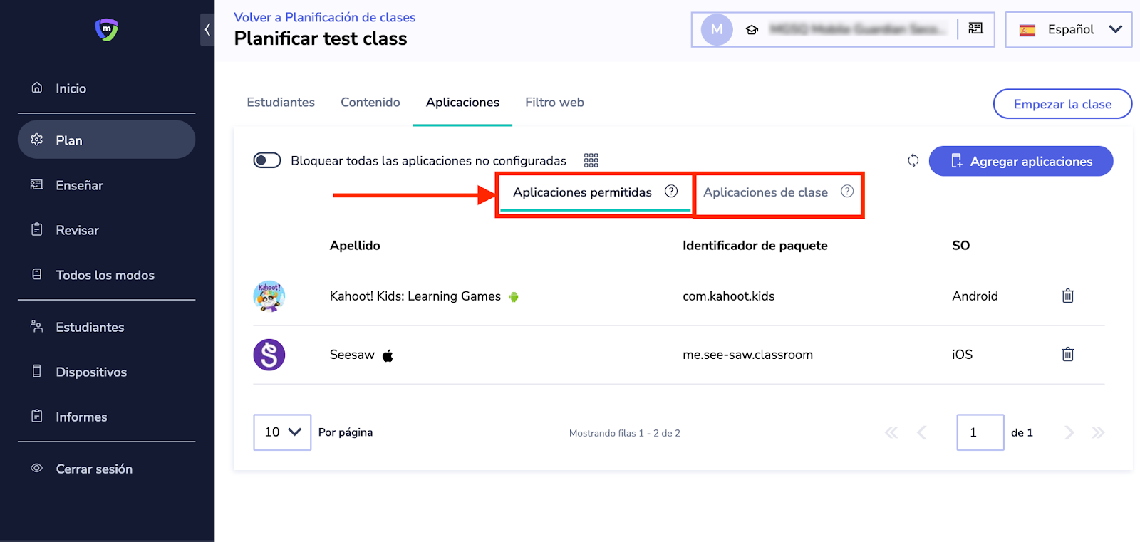 - Aplicaciones permitidas le permite definir qué aplicaciones pueden utilizar sus estudiantes durante una clase. Solo las aplicaciones que figuren en la lista estarán permitidas cuando esta clase esté activa. En este caso, lo más probable es que las aplicaciones ya se encuentren en los dispositivos de los alumnos.