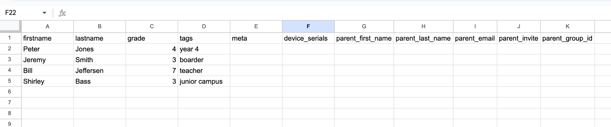 - Cada estudiante nuevo es una fila nueva, como se muestra arriba.