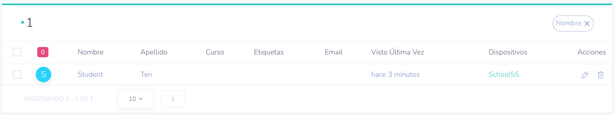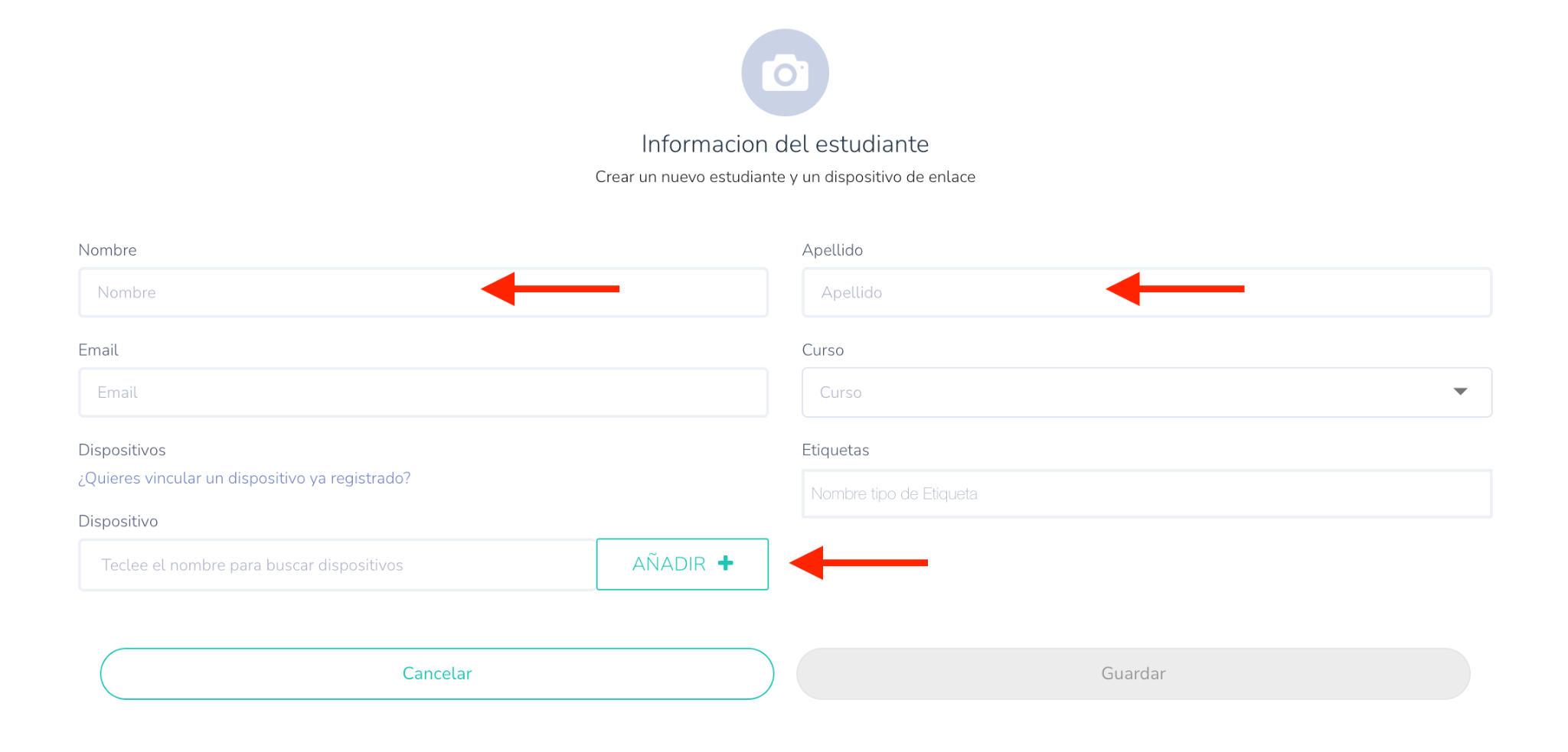 - Dispositivo: Busque un dispositivo existente y haga clic en “AÑADIR” para asociar el dispositivo con el nuevo estudiante.
