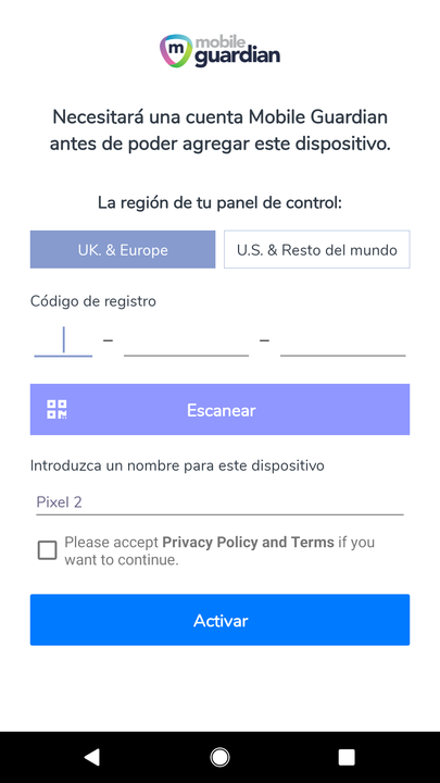 Ingrese su código de registro manualmente o escanéelo mediante el código QR. Este código se encuentra disponible en su panel de control de Mobile Guardian.