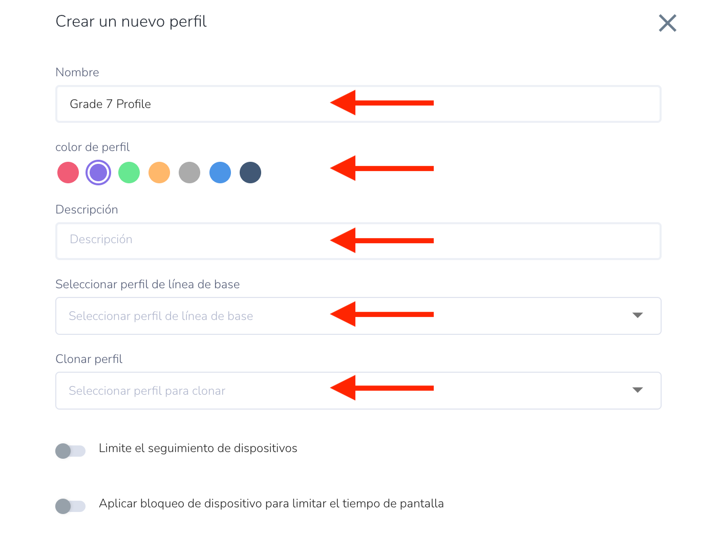 - Color del perfil (Profile Colour): Opcionalmente, seleccione un color para el perfil.