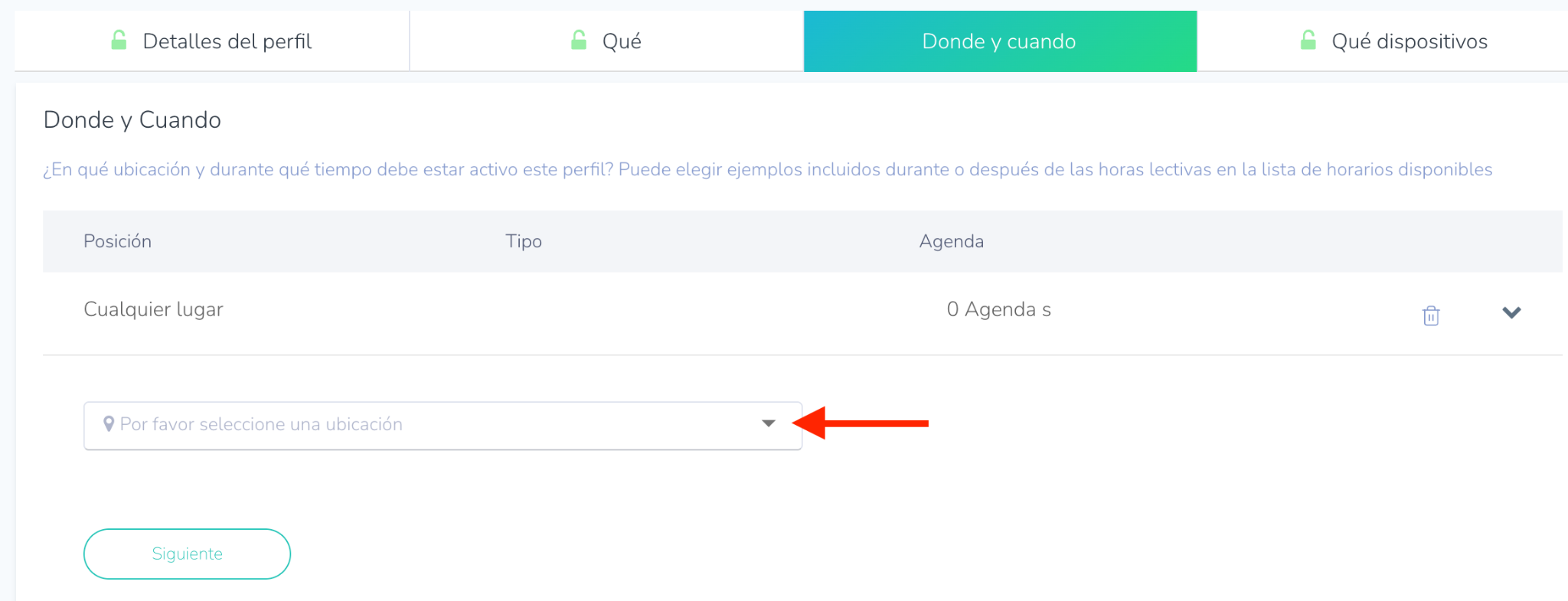- Dónde (Where): Especifique las ubicaciones donde se monitorean los dispositivos. Cree ubicaciones en la sección de Zonas (Zones) y asígnelas a los perfiles.