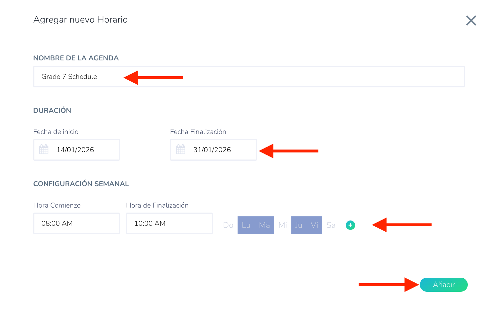 - Configurar los ajustes del horario: