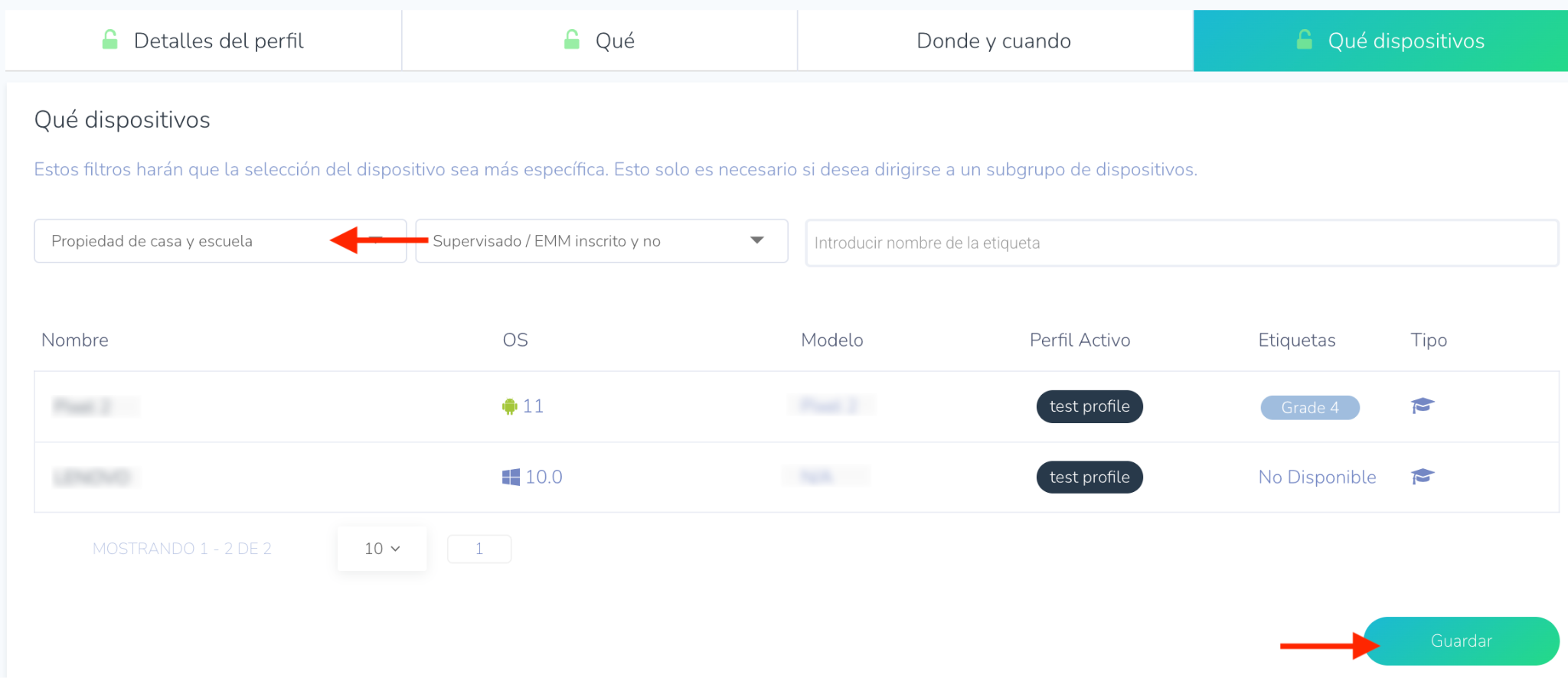 - En Qué dispositivos, elija si desea asignar el perfil a dispositivos Propiedad del Alumno (home-owned), Propiedad de la escuela (school-owned) o a todos los dispositivos.