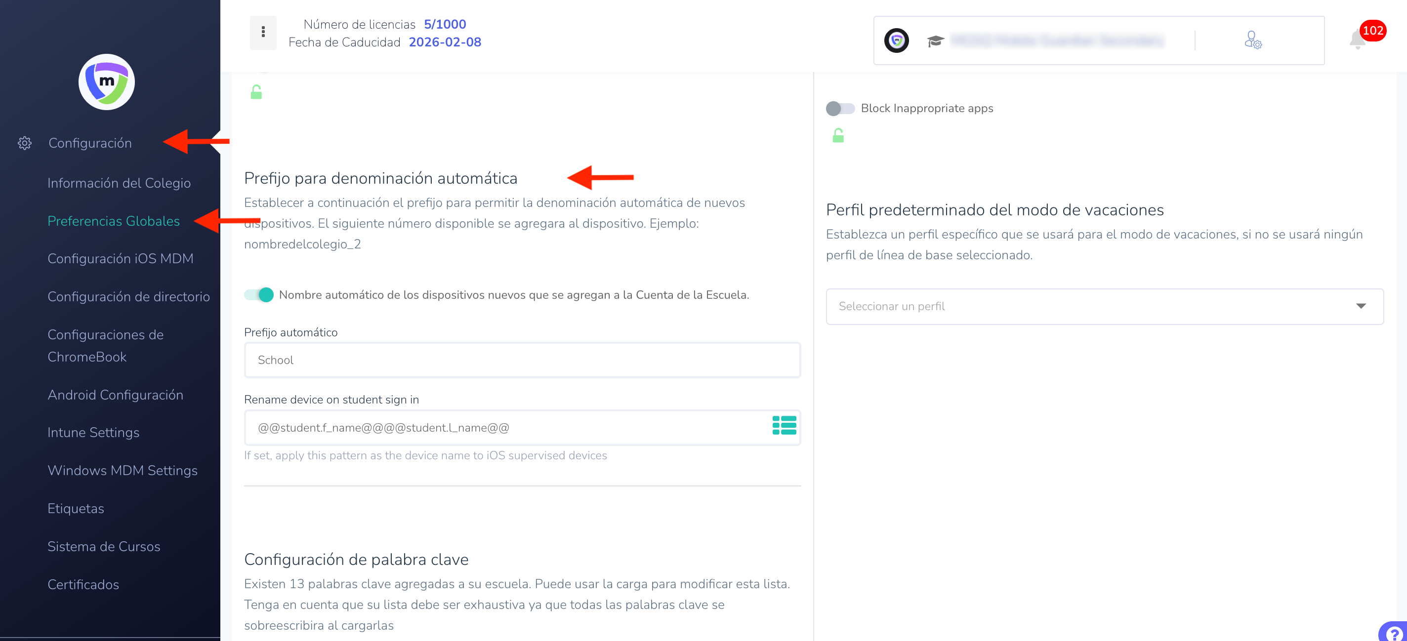 Inicie sesión en Mobile Guardian Vaya a Configuración Seleccione Preferencias globales.