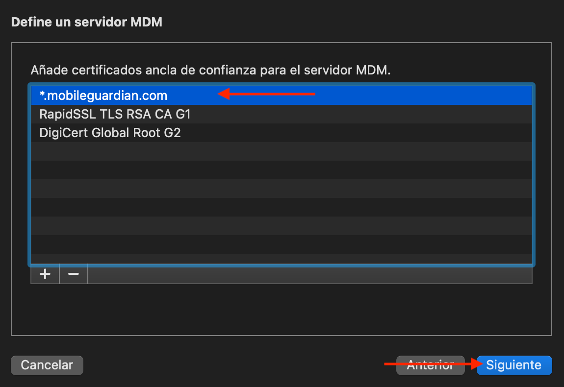 - Asegúrese de seleccionar el certificado de anclaje de confianza para el servidor MDM, *.mobileguardian.com, y haga clic en Siguiente.