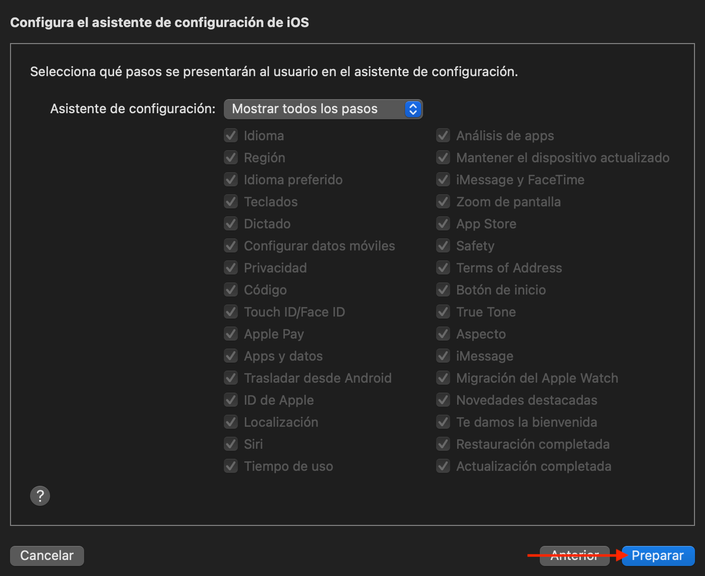 - Configure los pasos que desea que el asistente de configuración inicial de iOS presente al usuario. Luego, haga clic en “Preparar”.