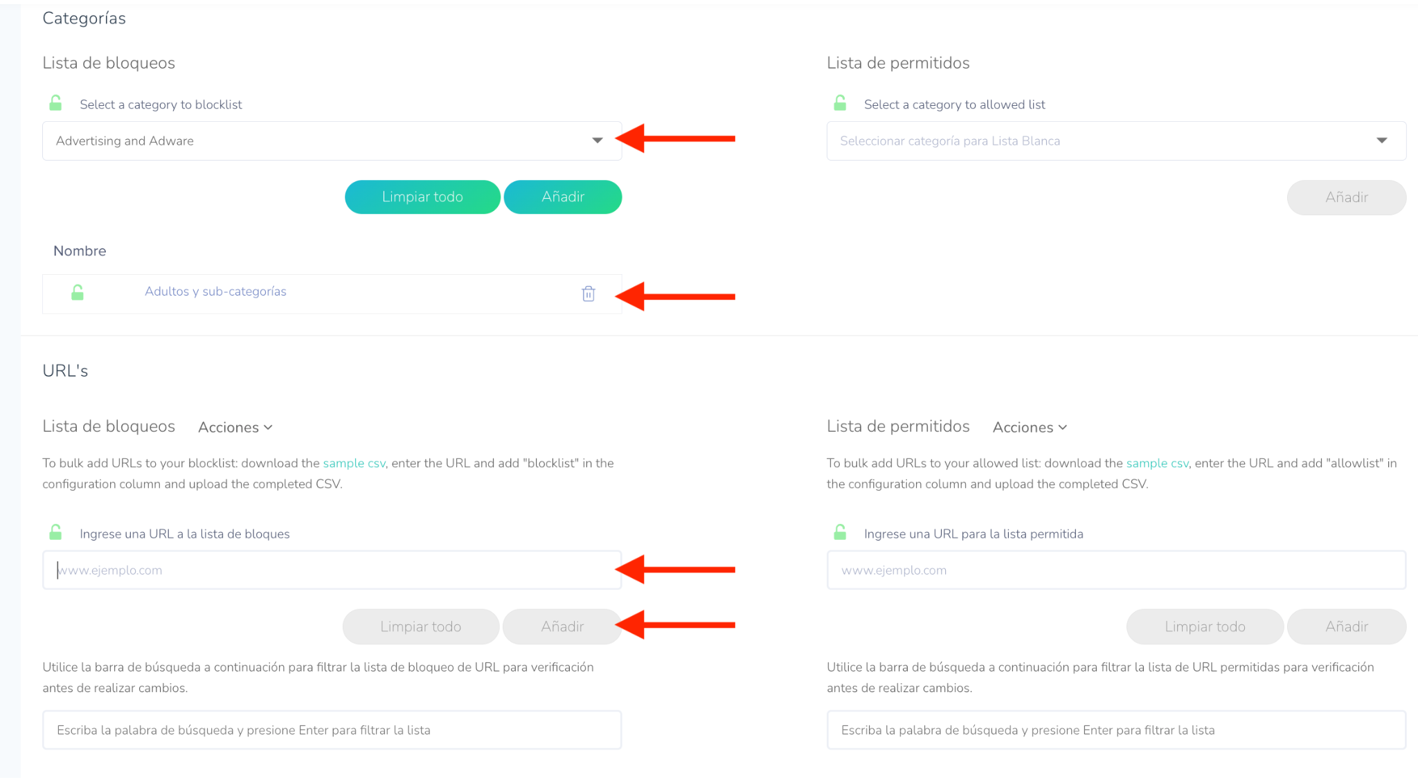 Añadir categorías y URL a la lista de bloqueo: