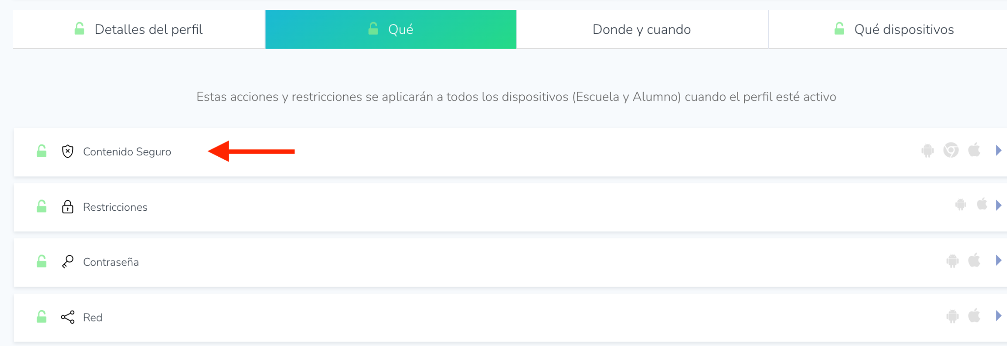 - Navegue a Perfiles (Profiles), seleccione el Perfil, la pestaña correspondiente y seleccione Contenido seguro (Safe Content).