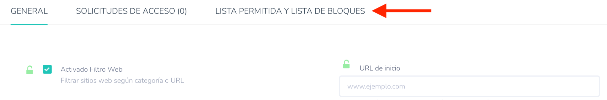- Al seleccionar "Activado Filtro Web", se mostrará la pestaña "Lista de permitidos y Lista de bloqueados".