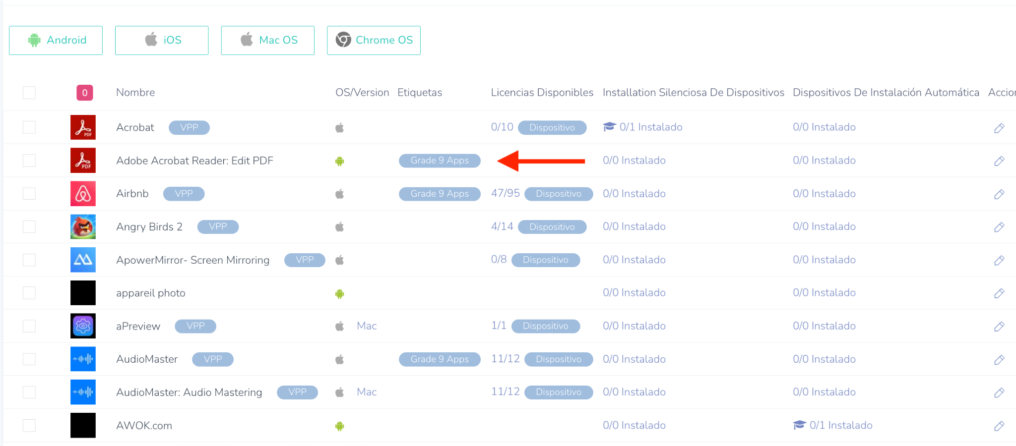 - El Dispositivo A tiene la etiqueta 'Grade 9 Apps'
