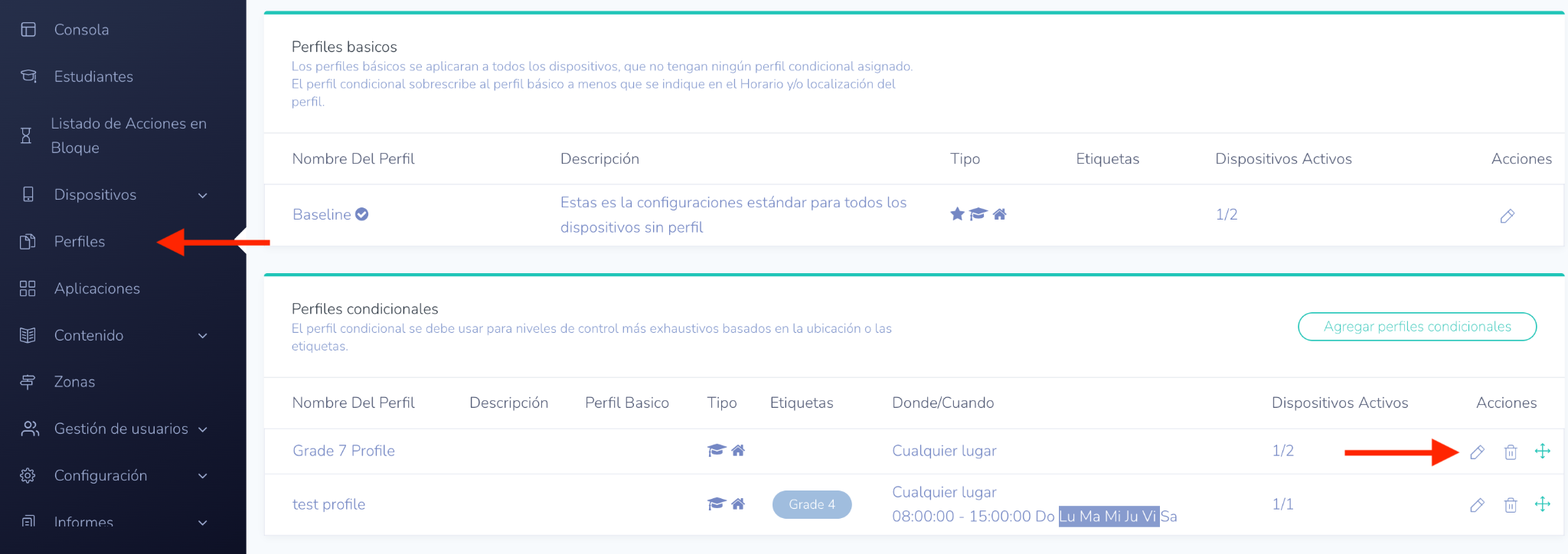 - Seleccionar un perfil para editar: Haga clic en el icono del lápiz en el extremo derecho, bajo la columna de Acciones, para el perfil que desea editar.