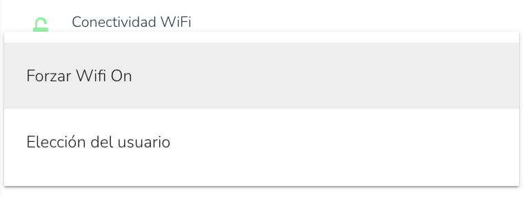 - Gestionar ajustes de Wi-Fi: Establezca los ajustes de Wi-Fi en "Forzar activado" (Force On), "Forzar desactivado" (Force Off) o "Elección del usuario" (User's Choice).