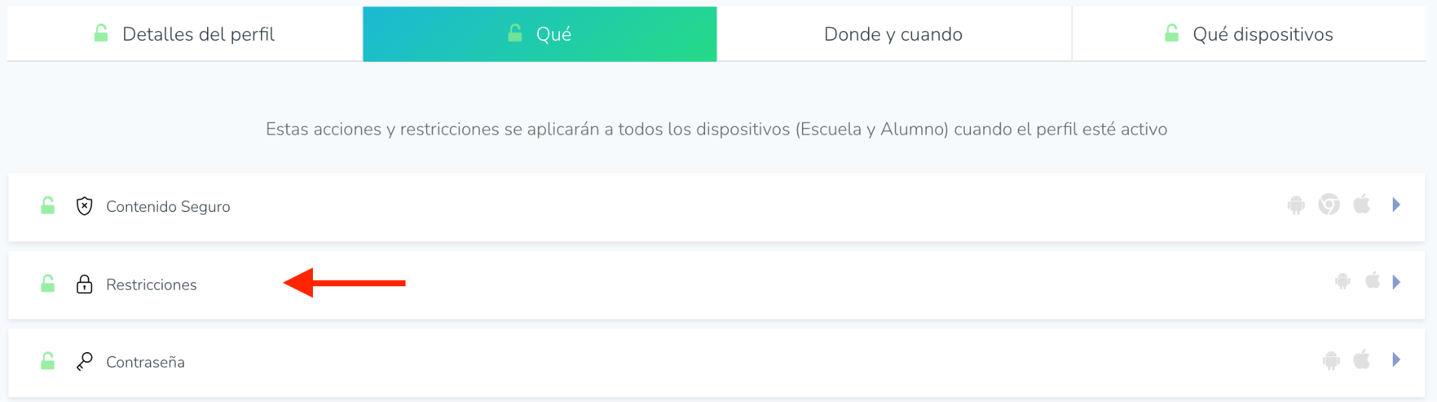 - Abrir restricciones: Haga clic en la opción Restricciones (Restrictions) del perfil seleccionado.