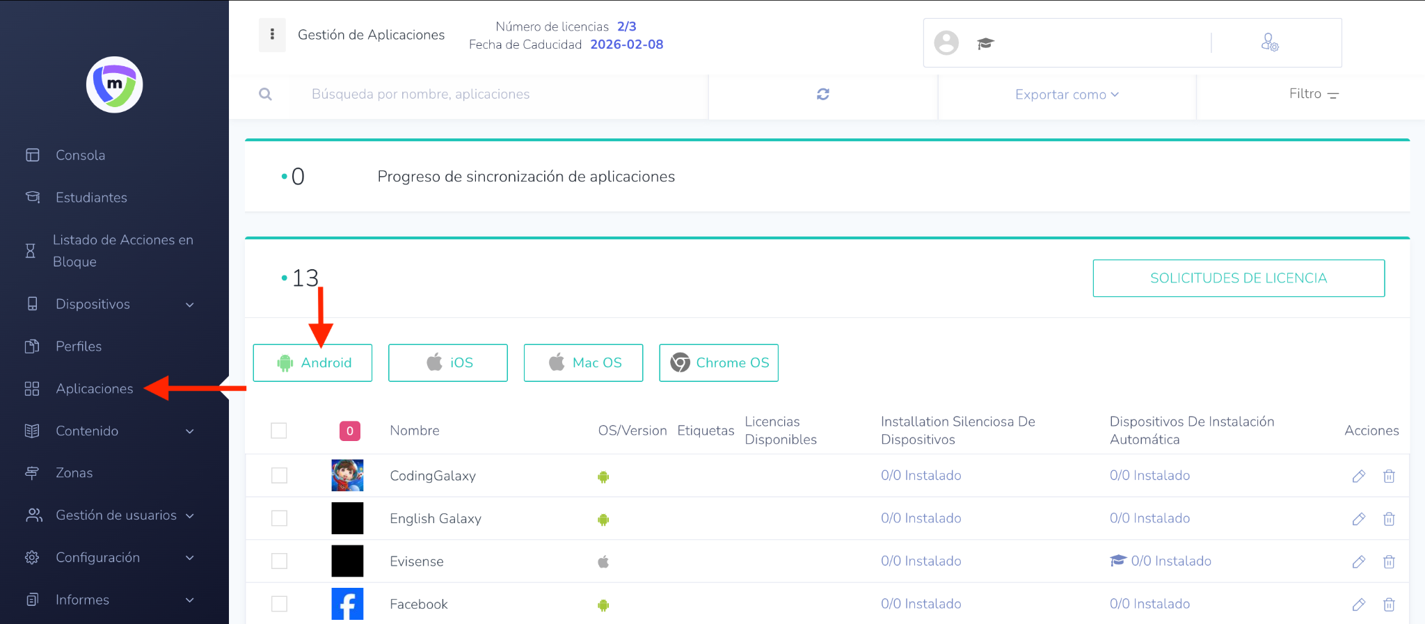 - Aplicaciones de Android: Haga clic en "Android" y luego seleccione "Búsqueda de aplicaciones" en el menú desplegable.