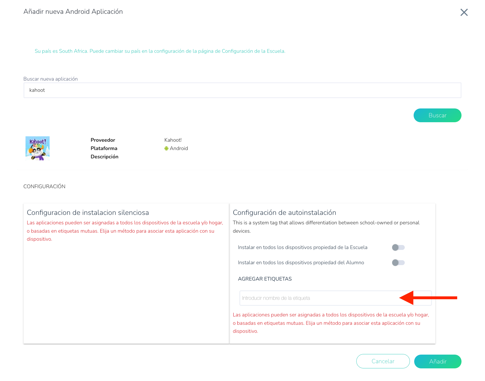 Configurar los ajustes de instalación: Después de buscar y añadir la nueva aplicación, puede configurar los ajustes de instalación mediante la asignación masiva de etiquetas o seleccionando los controles deslizantes para asignarla a todos los dispositivos de propiedad de la escuela o del hogar.