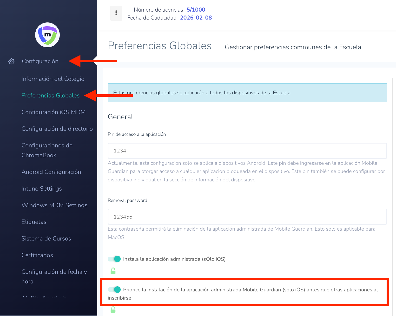 - Priorizar instalación: Active la opción para priorizar la instalación de la aplicación Mobile Guardian al momento del registro (enrollment).