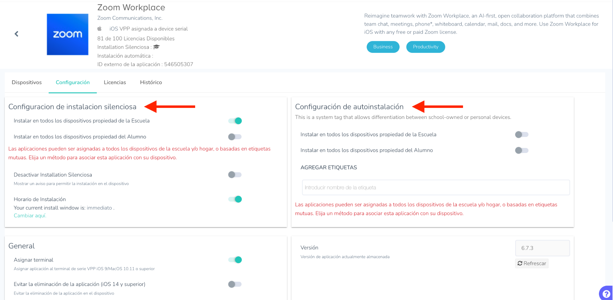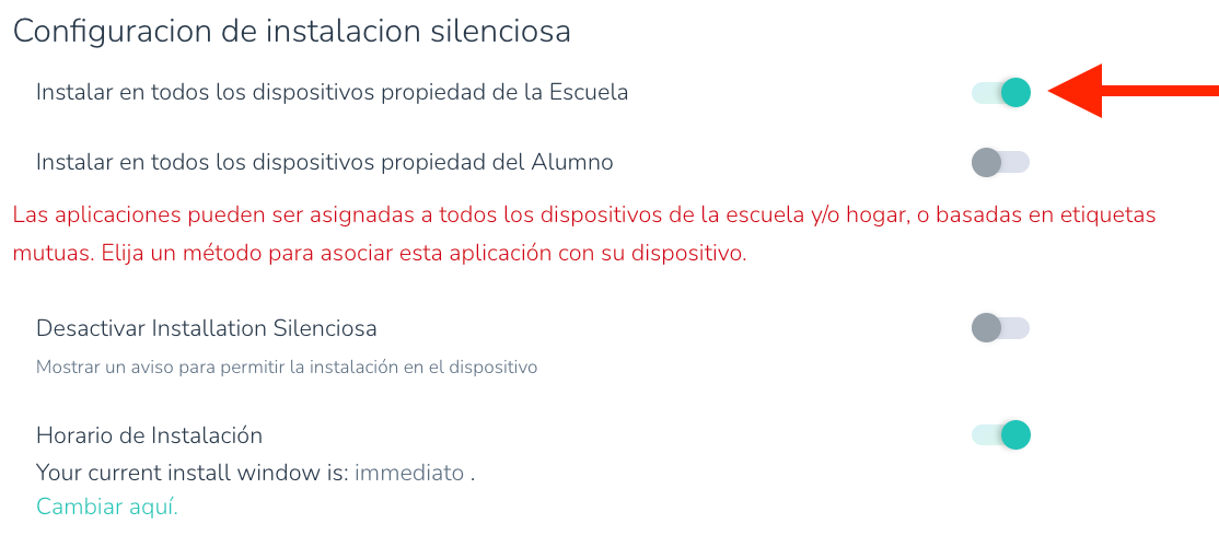 - Configuración de instalación automática (Auto-Install): Asigne la aplicación a todos los dispositivos propiedad de la escuela o propiedad del hogar.