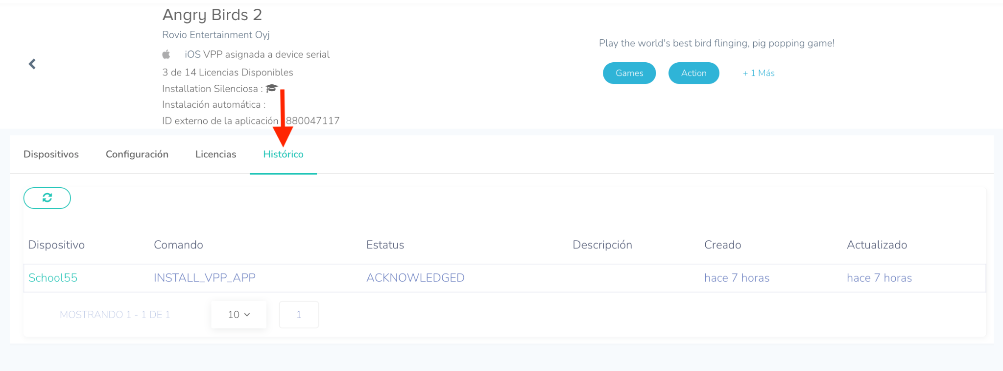 La sección de Application History (Historial de la aplicación) proporciona un historial de comandos detallado para una aplicación específica, incluyendo a qué dispositivos se enviaron los comandos y el estado de cada uno. Esta función es particularmente útil para solucionar problemas de despliegue.