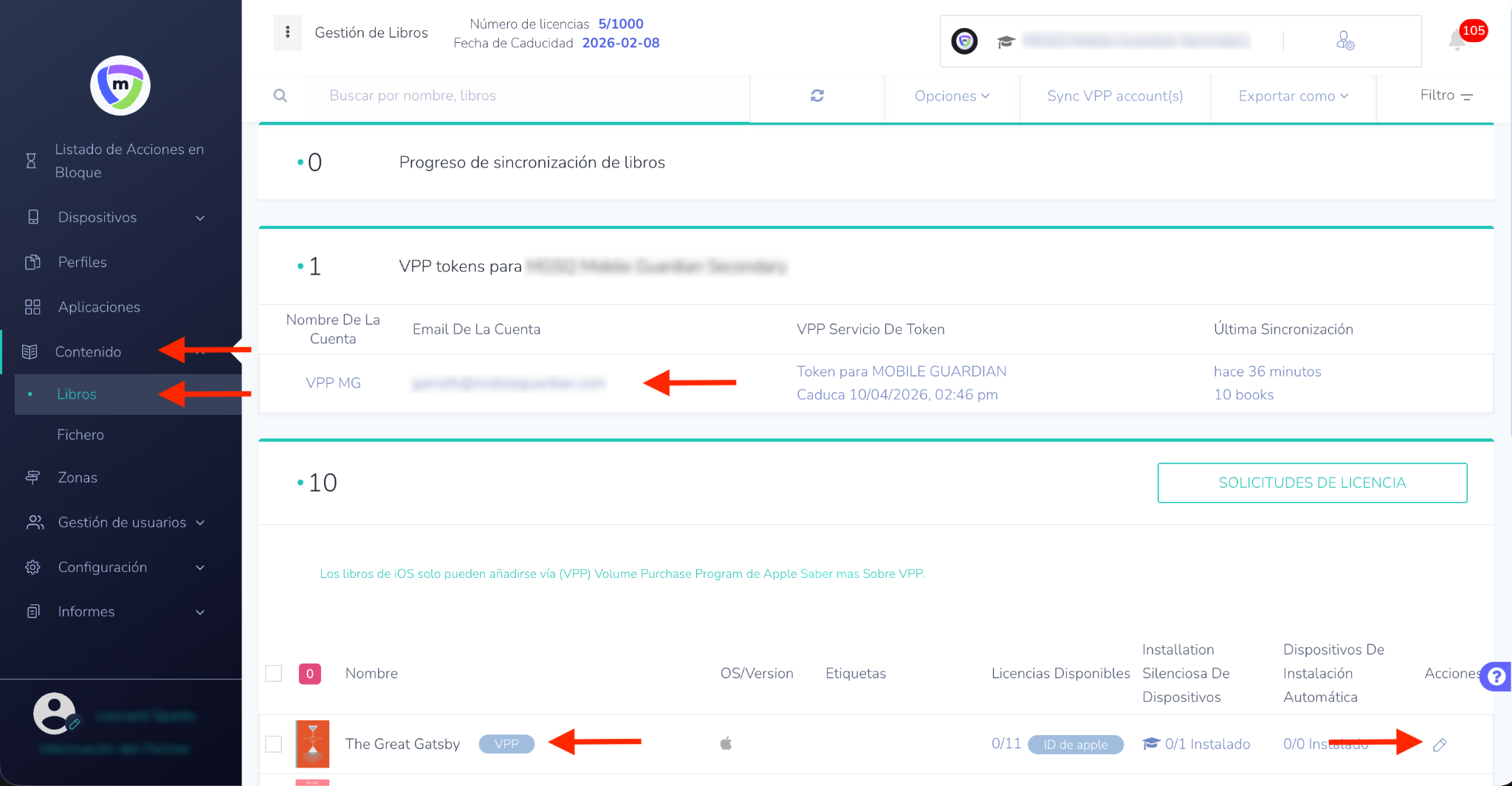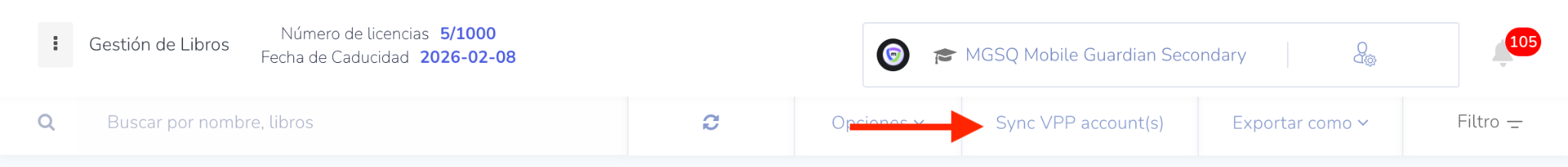 Sincronizar cuenta VPP: Regrese a Gestión de Libros (Book Management) seleccionando Books en el menú de la izquierda, bajo la sección Content. Haga clic en Sync VPP account.